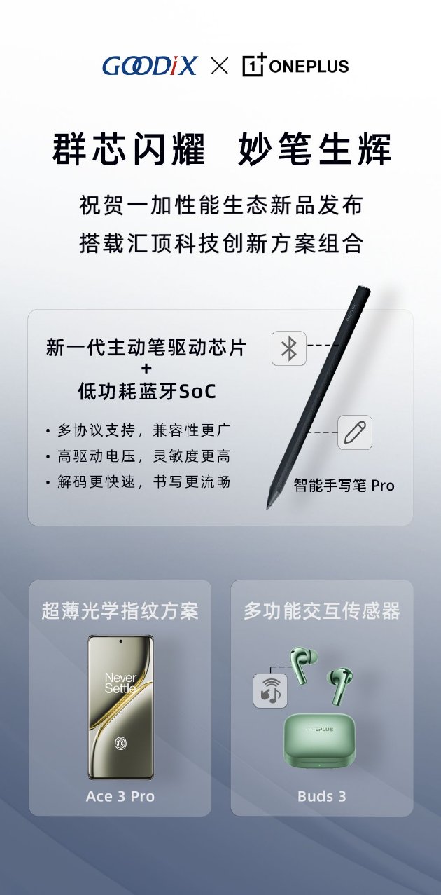 本次发布的一个亮点,是一加平板Pro可选配智能手写笔Pro,其采用了汇顶科技提供的新一代主动笔驱动芯片+低功耗蓝牙SoC的整体解决方案。汇顶新一代主动笔驱动芯片支持客户端的最新主动笔协议,具有更好的兼容性;同时更高的驱动电压,可增加笔悬空识别高度,让笔和屏幕间感应更灵敏;更快速的解码能力,让书写更为流畅稳定。