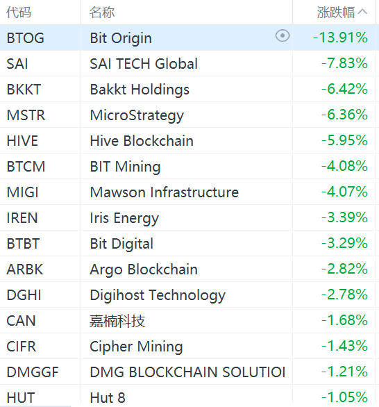 比特币跌破61000美元,拖累美股市场数字货币概念股集体下挫。其中,Bit Origin跌近14%,Bakkt Holdings、MicroStrategy跌超6%,Bit Digital跌超3%,嘉楠科技、Coinbase跌超1%。