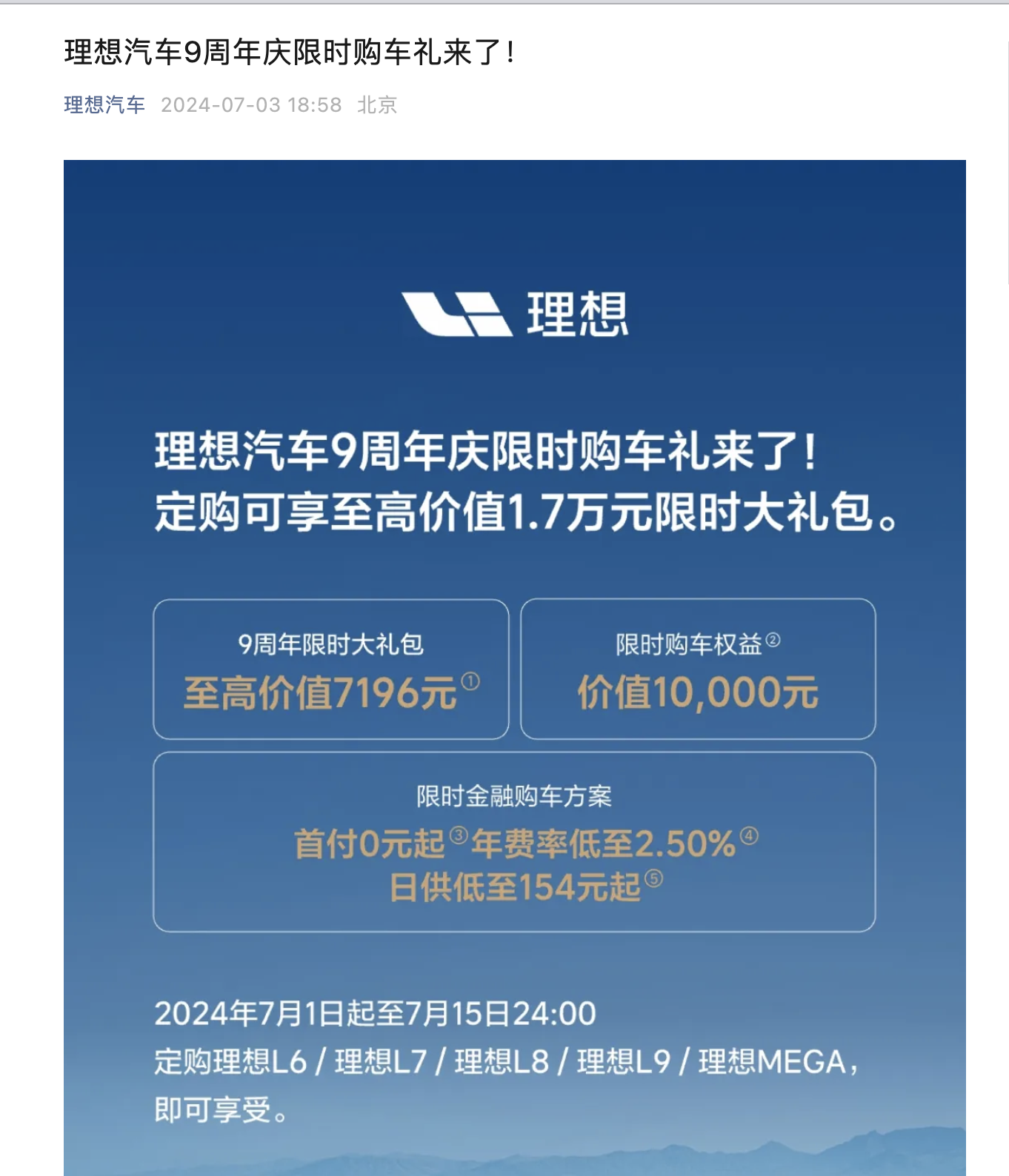 7月3日,据理想汽车微信公众号消息,推出理想汽车9周年购车礼,自7月1日起至7月15日24时,定购理想L6/理想L7/理想L8/理想L9/理想MEGA即可享受限时购车权益1万元与0首付金融购车方案。