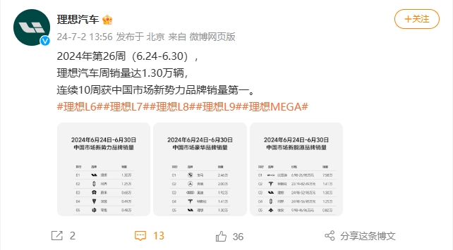 据理想汽车微博7月2日发布的数据,2024年6月24日-6月30日期间,理想汽车周销量达1.3万辆,连续10周获中国市场新势力品牌销量第一。