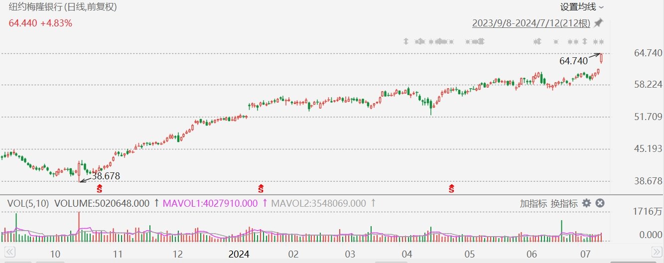 纽约梅隆银行(BK.US)涨超5%报64.74美元,创历史新高。纽约梅隆银行公布财报显示,第二季度调整每股收益1.51美元,超出市场预期的1.43美元;销售额4.597亿美元,超出市场预期的4.523亿美元;净利息收入为10.3亿美元,超出市场预期的10.1亿美元。