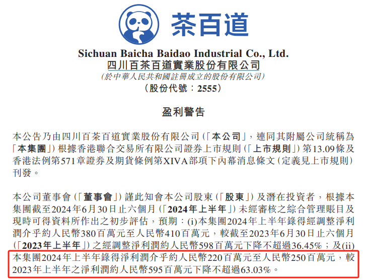 上市不足4个月,投资者未等来茶百道上市后首份半年捷报,却等来一份盈利警告。2024年8月9日,茶百道发布盈利警告,根据初步评估,预期2024年上半年经调整净利润将较去年同期下降不超过36.45%,净利润预计介于约人民币2.2亿元至2.5亿元,而去年同期为约人民币5.95亿元,下降不超过63.03%。