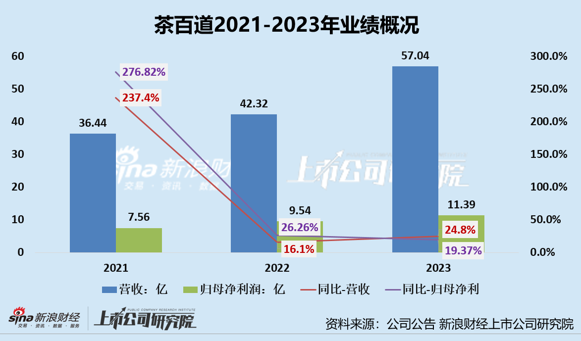 上市之前,茶百道的全年业绩还保持着业绩双增。2021年至2023年,茶百道实现营收分别为36.44亿元、42.32亿元和57.04亿元,分别同比增长237.40%、16.12%和34.80%;实现归属净利润分别为7.56亿元、9.54亿元和11.39亿元,分别同比增长276.82%、26.26%和19.37%。