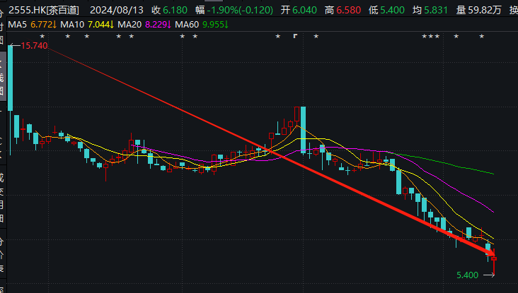 业绩表现及经营前景不佳,投资者也纷纷用脚投票。4月23日,茶百道正式登陆港交所成为“新式茶饮第二股”,令众多投资者意想不到的是,茶百道上市即破发,低开10.06%,盘中跌幅一度突破38%,最终收12.8港元/股,首日跌幅达26.86%。此后不到4个月时间内,仍未改变茶百道股价向下的趋势,截至8月14日收盘,茶百道股价仅剩6.54港元/股,股价相较发行价下跌63%。