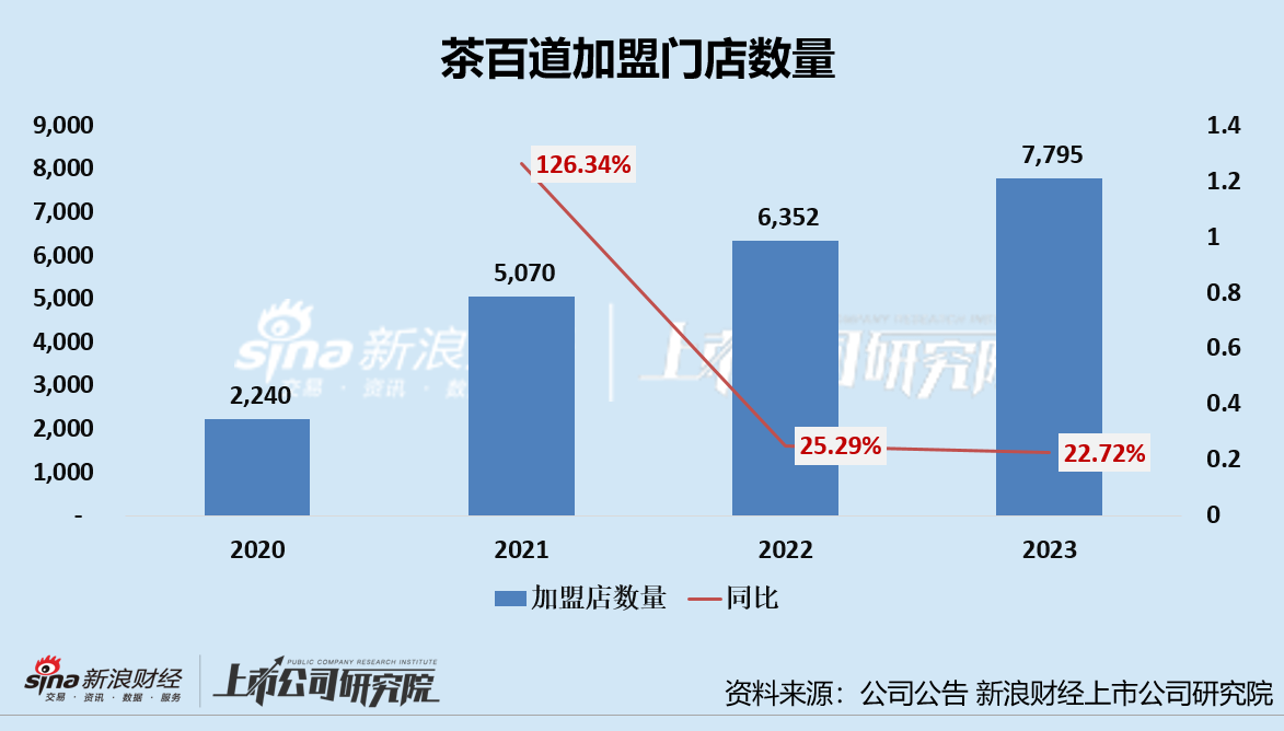具体来看茶百道,加盟模式是茶百道业务快速增长及成功的关键,但很关键的一点在于茶百道的持续扩店拉动营收增长的逻辑似乎可持续性较差。通过近年来加盟门店数量,我们不难看出,茶百道线下加盟门店早已过了“跑马圈地式”快速增长阶段,2022年起加盟门店增速大幅下滑仅同比增长25.29%,2023年加盟门店增速进一步下降至22.72%。
